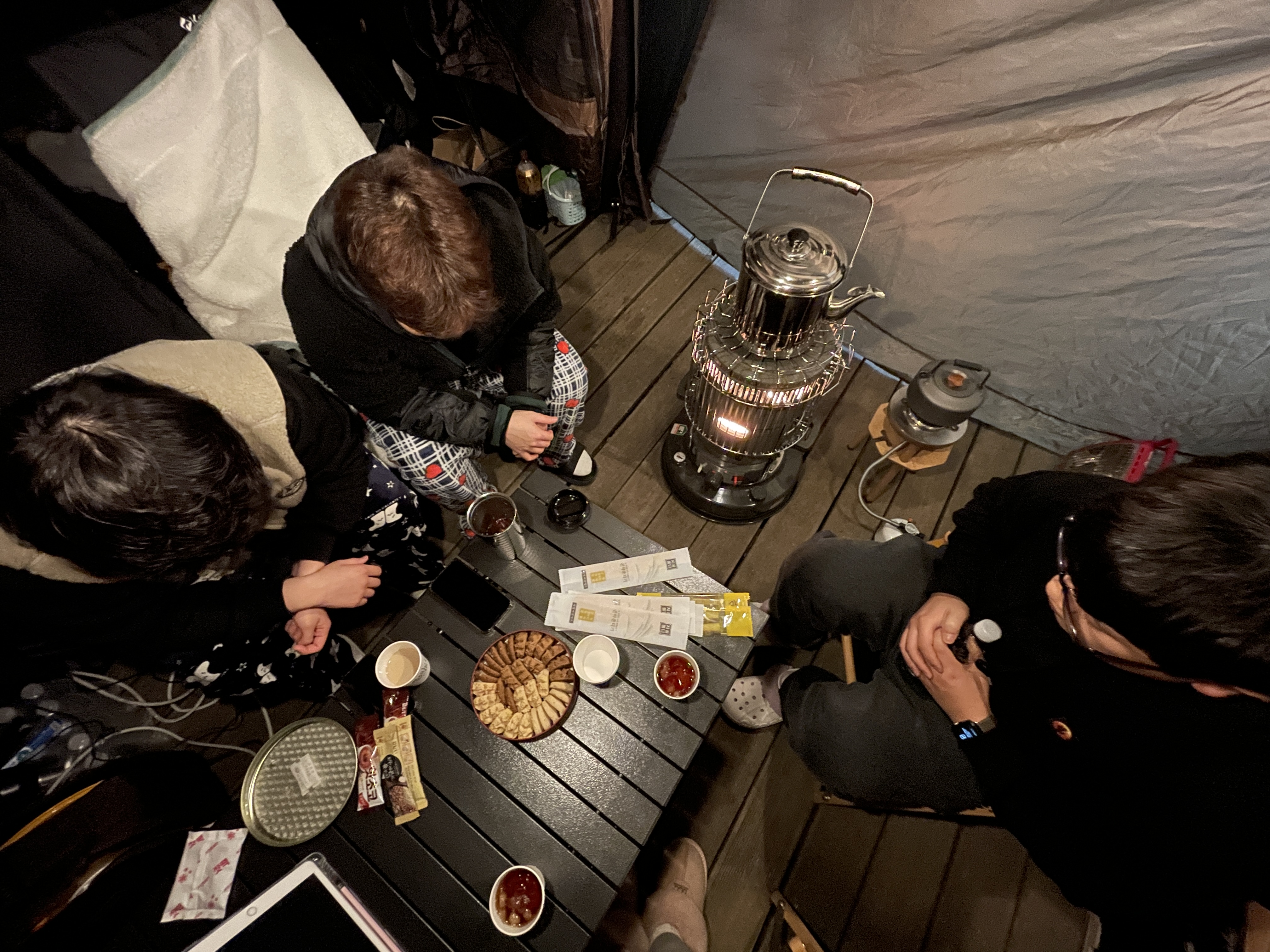 조용한 텐트 안의 대화와 웃음,