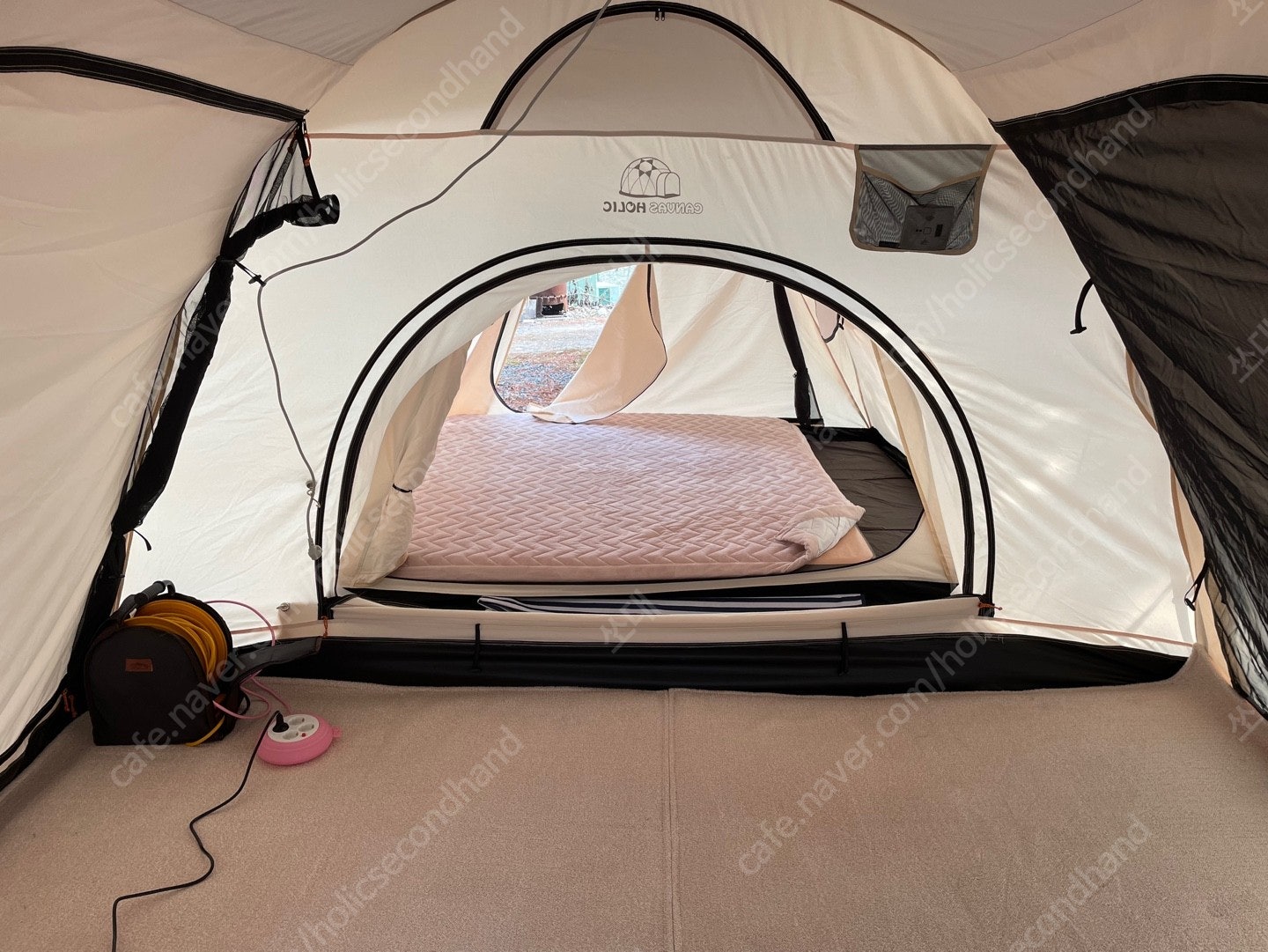 반대 측면은 깔끔한 디자인에 환기구가 잘 마련되어 있어서 공기 순환이 좋아요. 내부도 넉넉해서 침낭, 매트리스 깔고도 충분한 공간이 남습니다. 특히, 내부 높이가 있어서 답답한 느낌이 전혀 없더라구요.