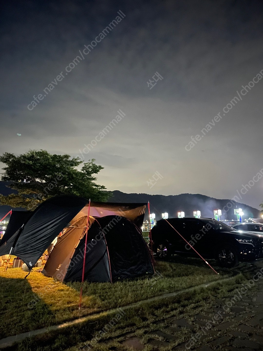 밤에 설치했을 때의 모습입니다. 내부에 조명을 달면 넓은 공간에서 여유로운 시간을 보낼 수 있었습니다. 바람에도 흔들림 없이 튼튼하게 고정되어 안전감이 느껴졌습니다.