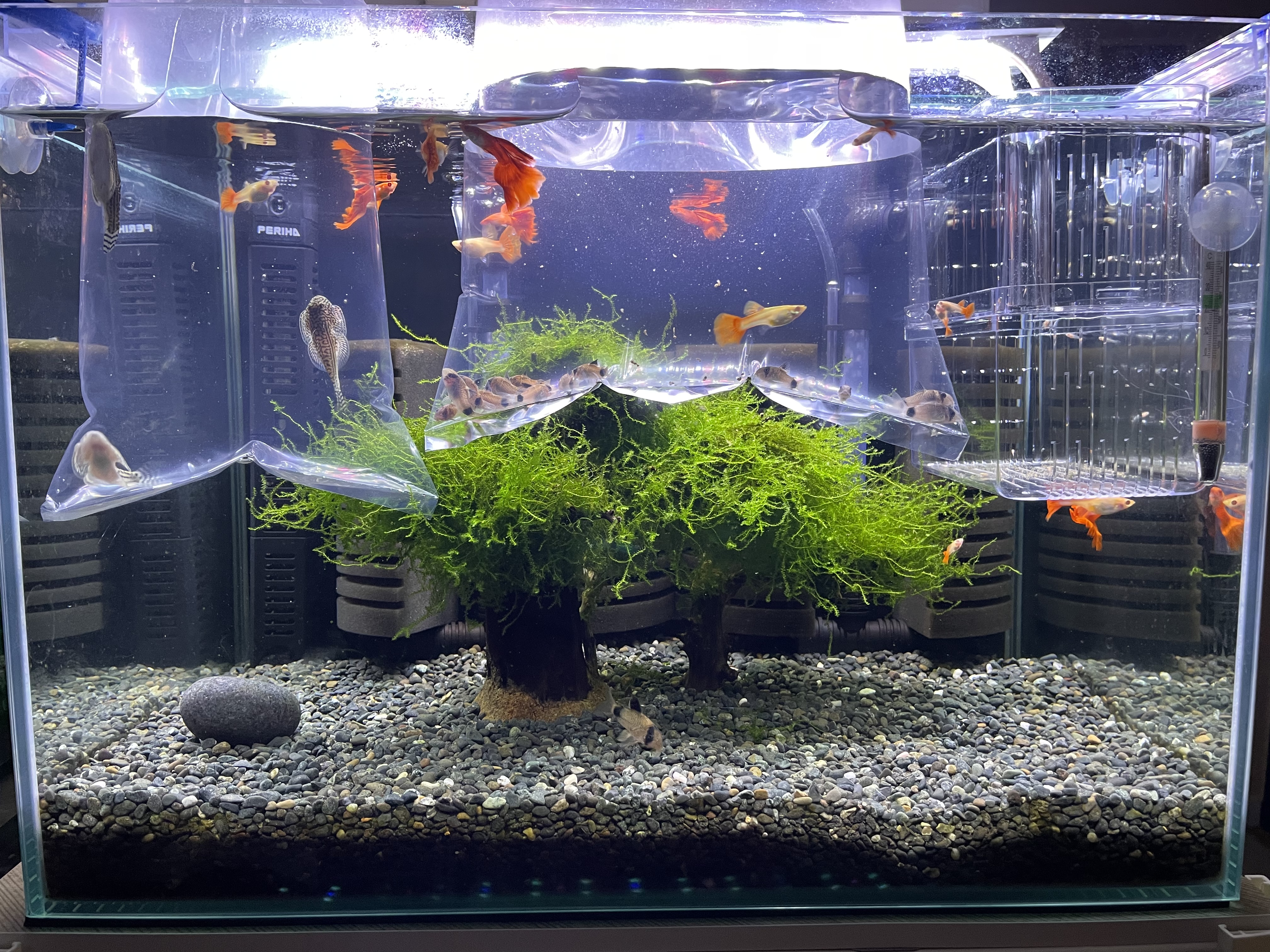 기존 본항에는 구피와 팬더코리, 사쿠라체리새우, 힐스트림로치가 함께 살고 있었지만,