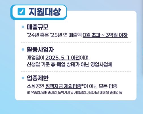 - 누가? → 연 매출 3억 이하 정상 영업 중인 소상공인
